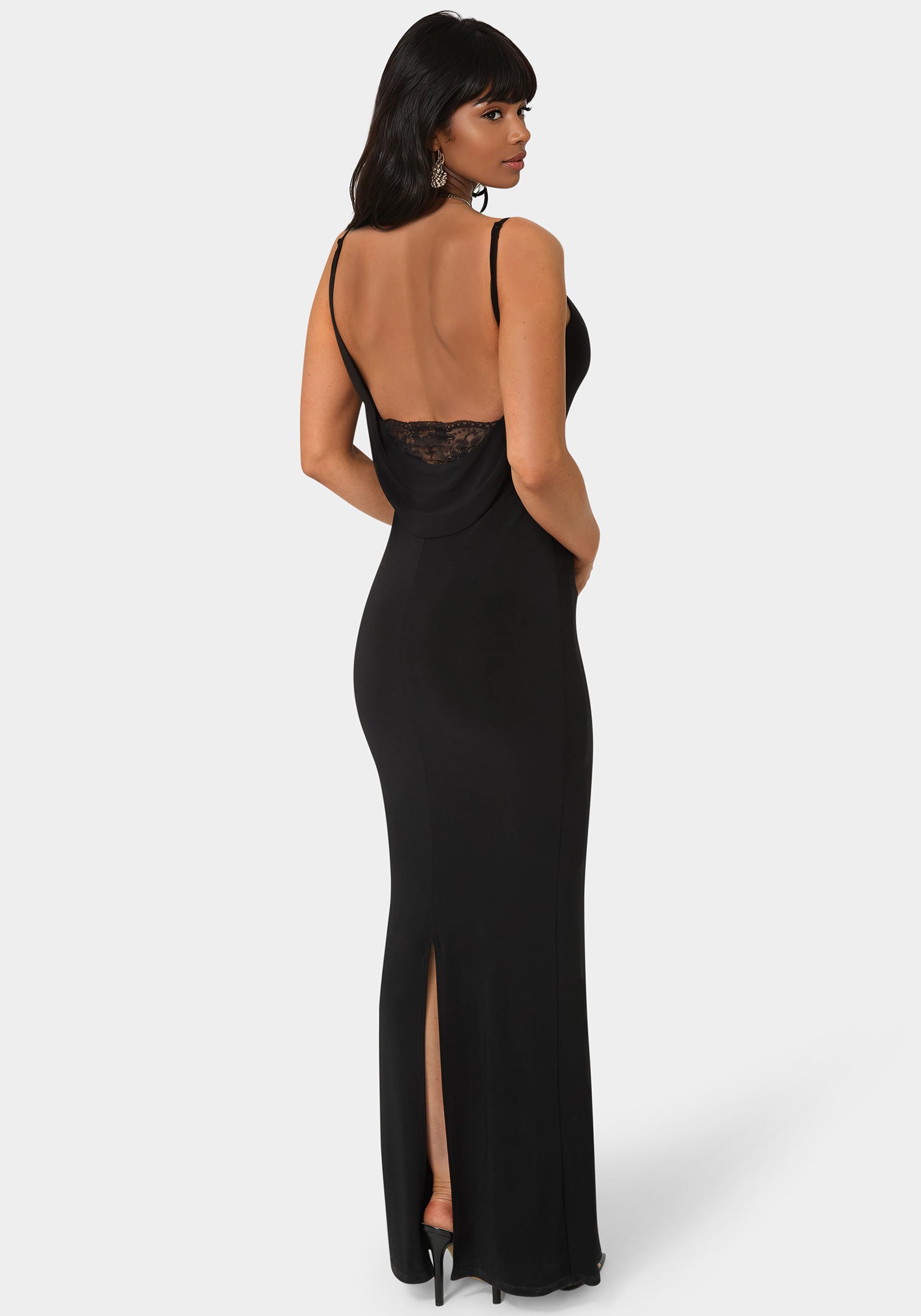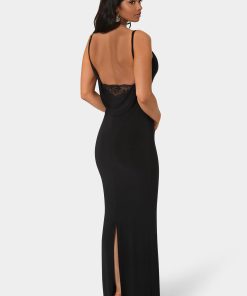 Sultry meets romantic in this backless maxi featuring delicate lace insets. Perfect for intimate dinners or enchanting celebrations, it’s designed to make an impression from every angle.