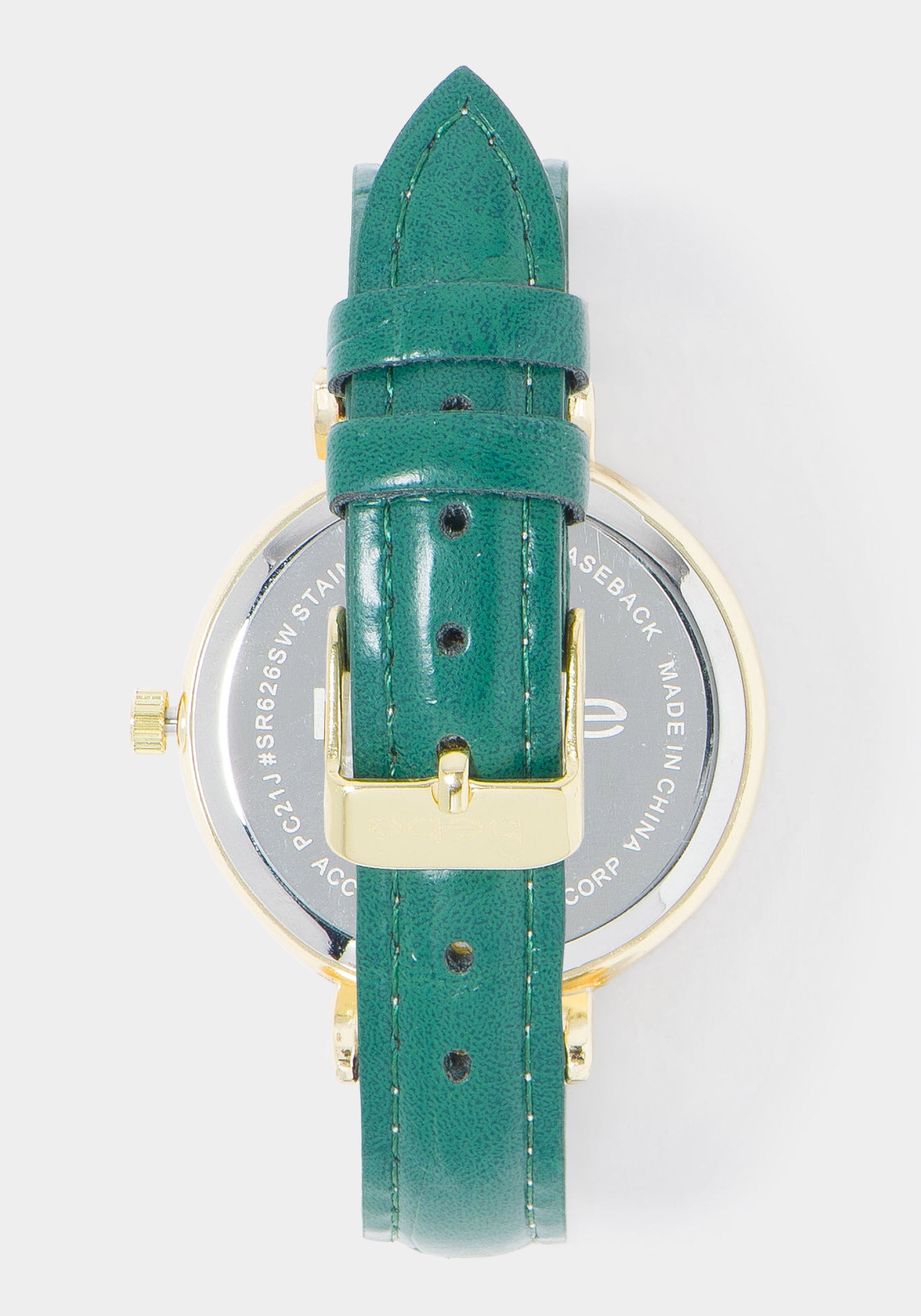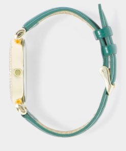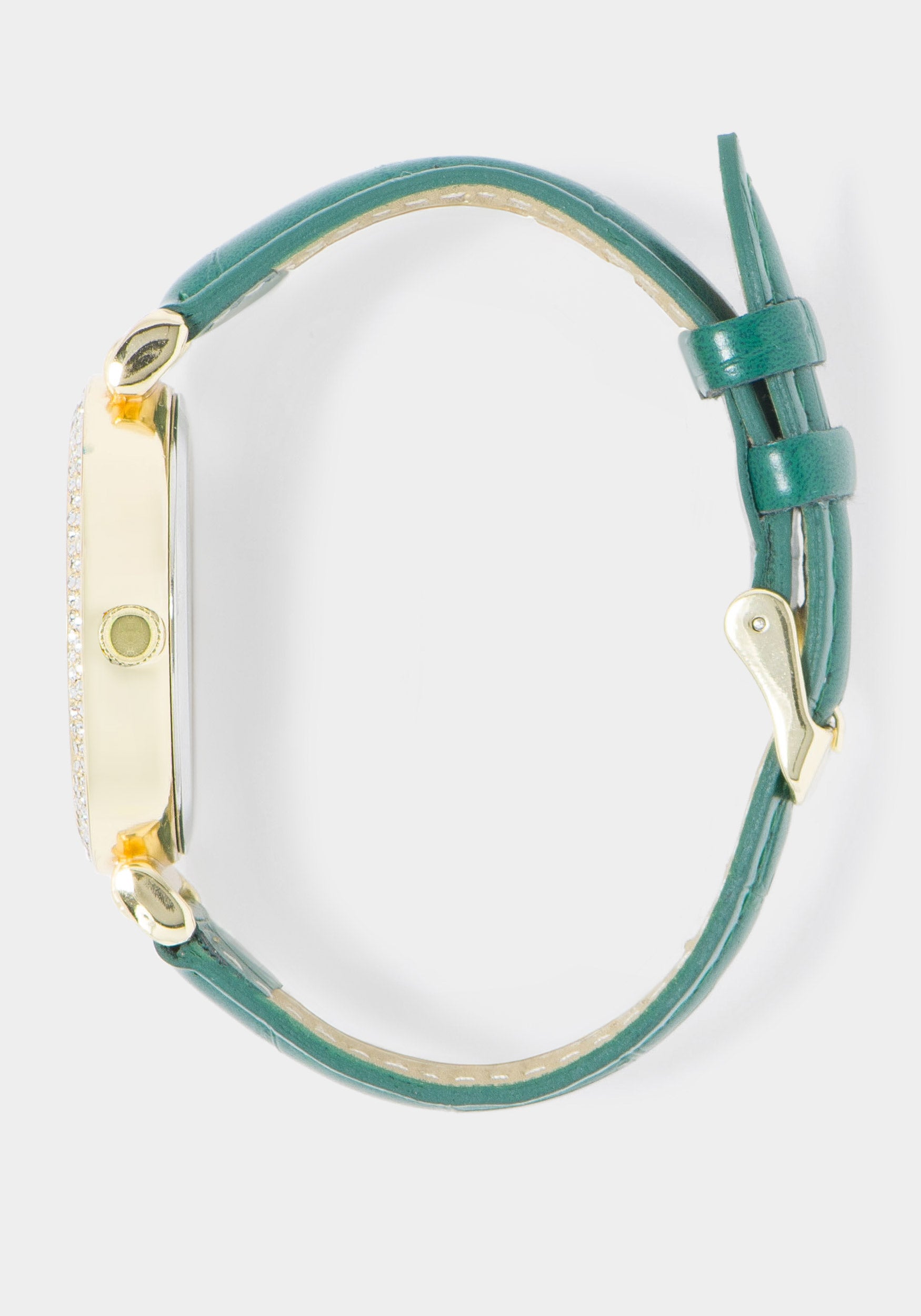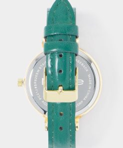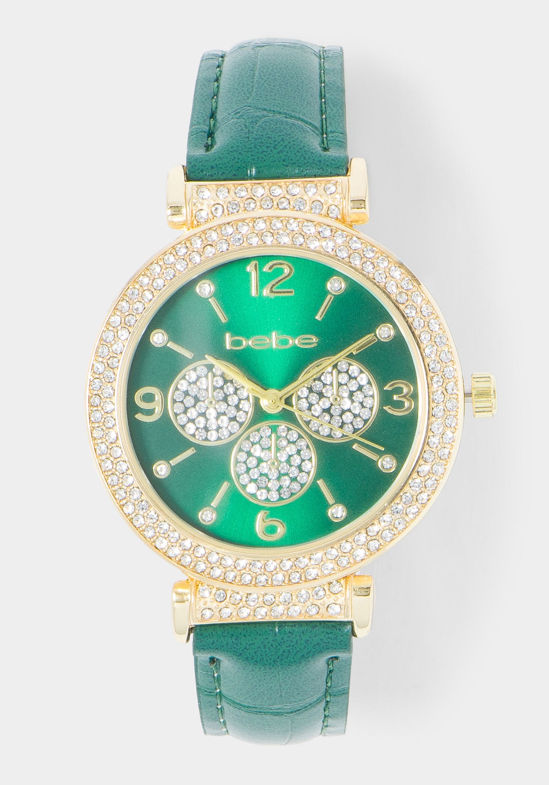 Add a pop of color to any outfit with a green crocodile-embossed strap watch. Embellished with crystal accents for an extra touch of glamour.