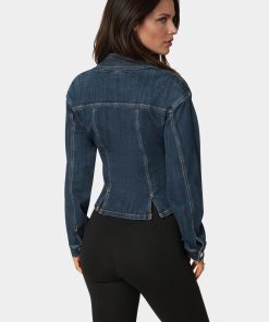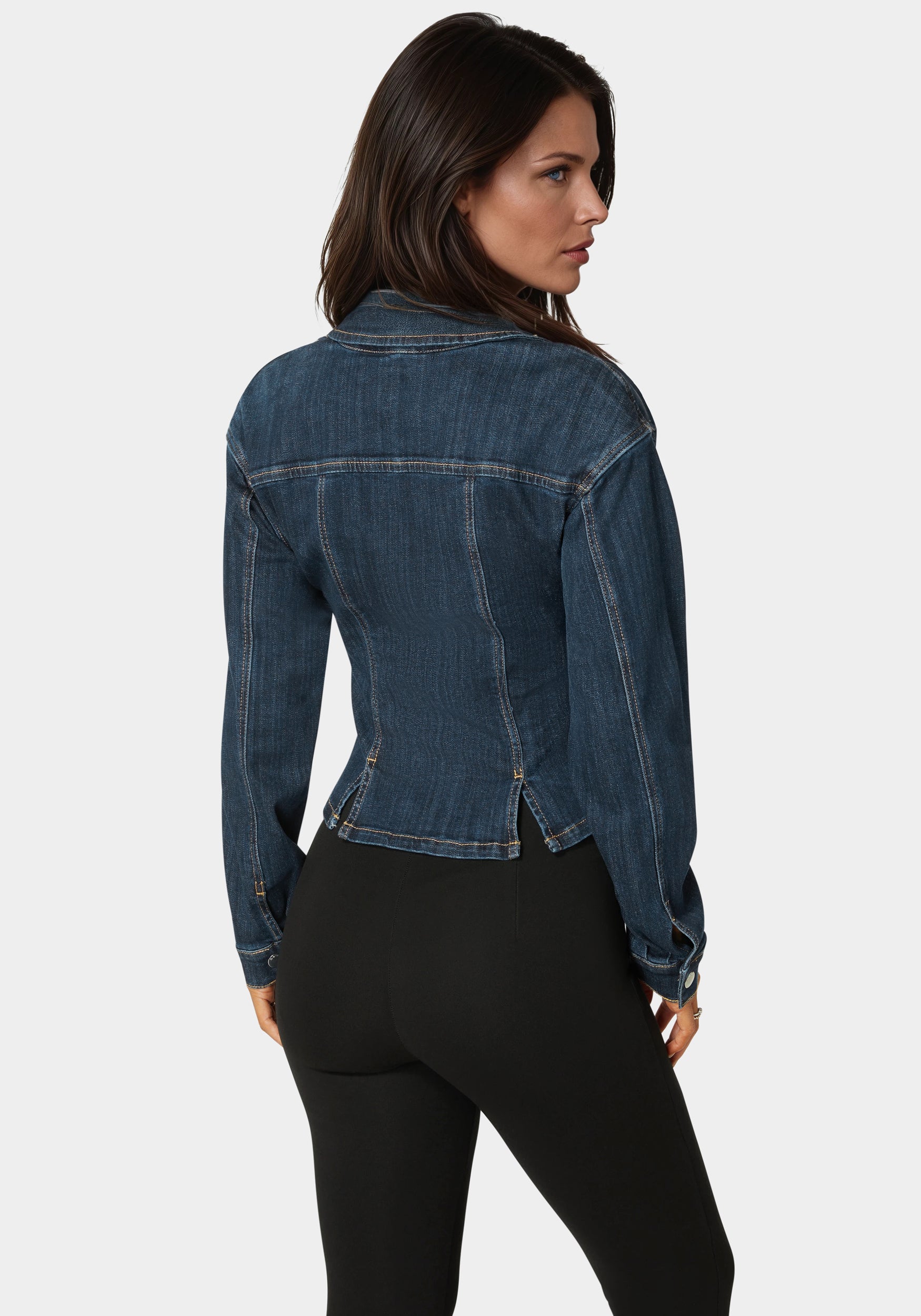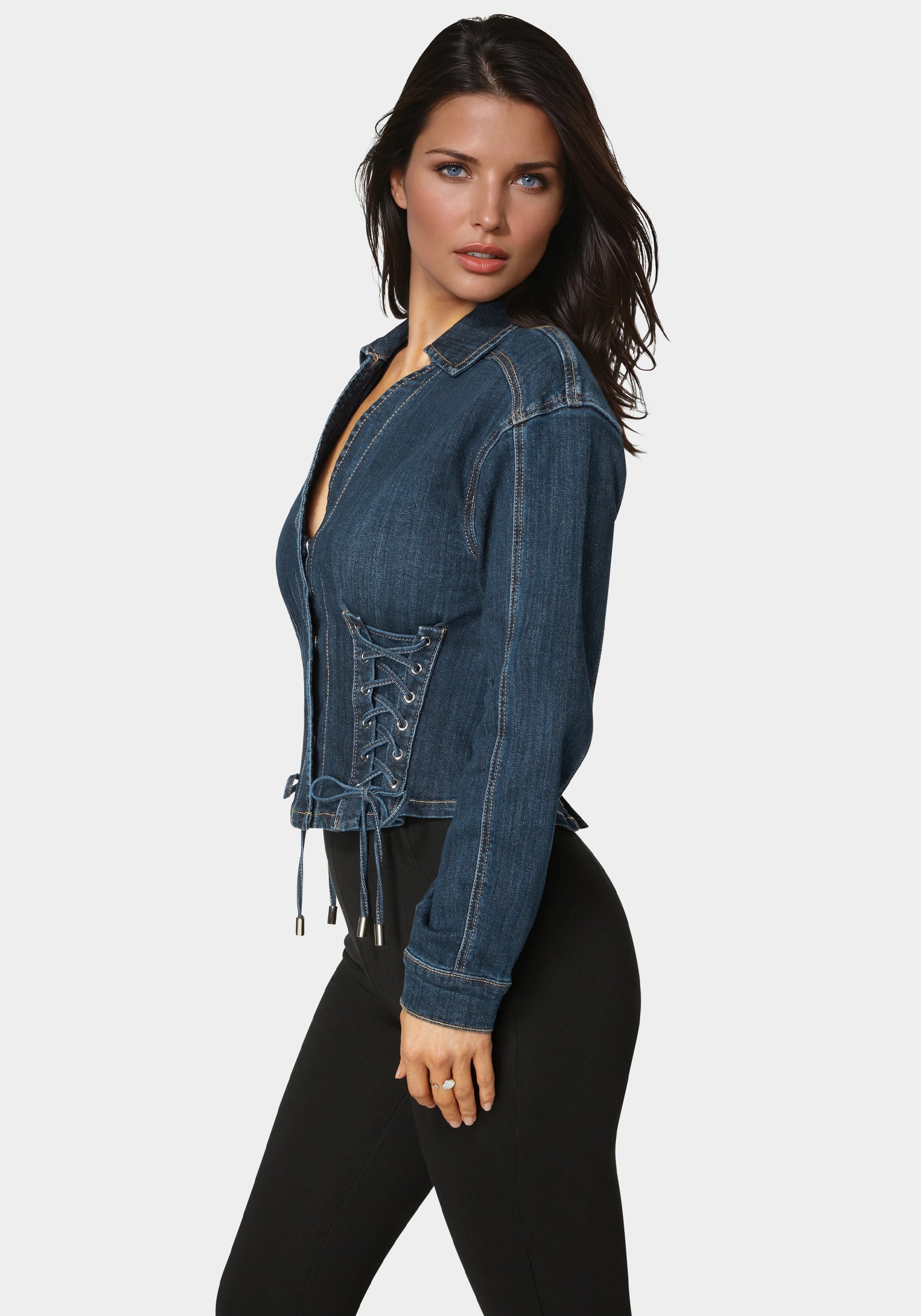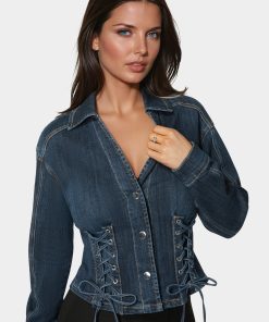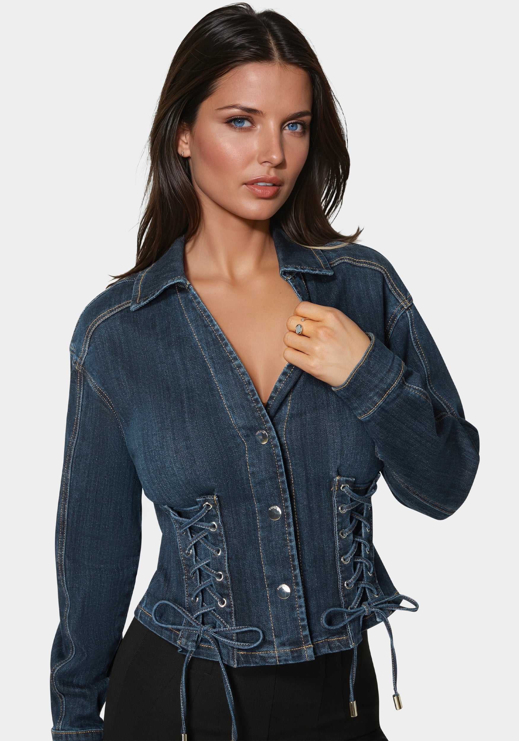Trendy denim jacket with corset-style lace-up, long sleeves, and metal snap front. An edgy addition to any casual outfit or layered look.