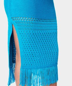 A side slit shows off your legs in a boho-inspired sweater skirt. Fringe detail lines the hem of a skirt that pairs perfectly with its matching blue top. Step into your favorite bebe heels to complete the look.
