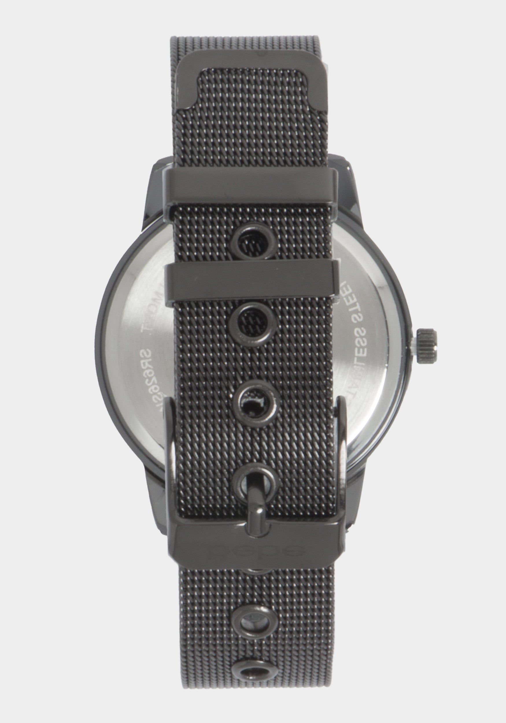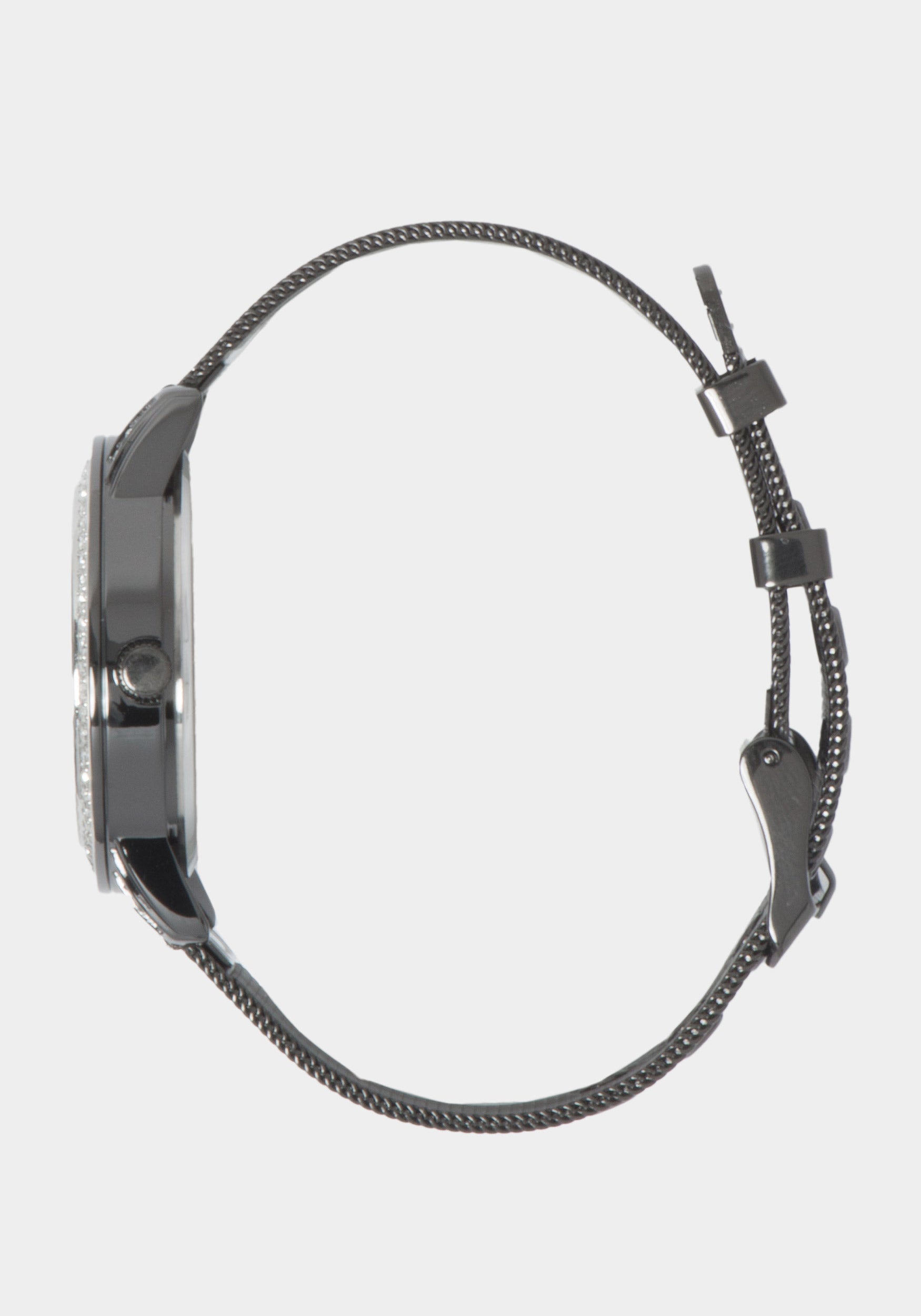 This versatile watch features a gunmetal tone and crystal bezel. It pairs well with any other piece of jewelry, making it the perfect accessory for any outfit.