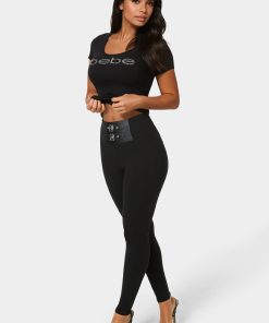 Edgy high waist leggings with a belt detail boast vegan leather shine; perfect for trendy outings.