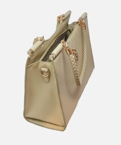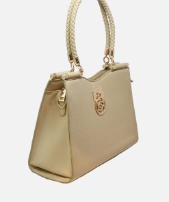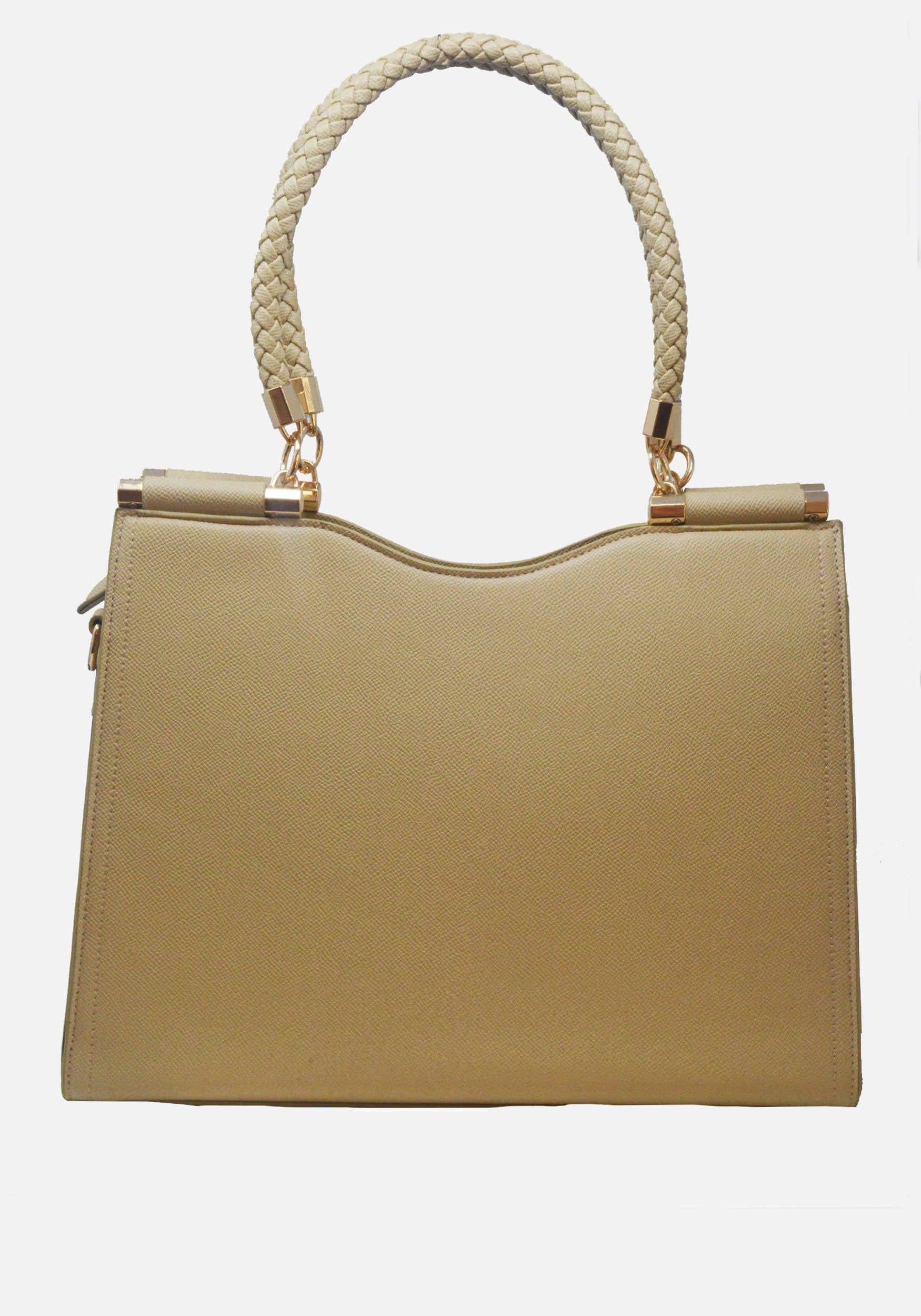 The perfect shopping companion is a stylish bag. This shopper bag features braided rope top handles, a detachable crossbody strap, and charm logo plate detail.