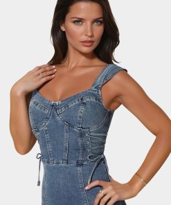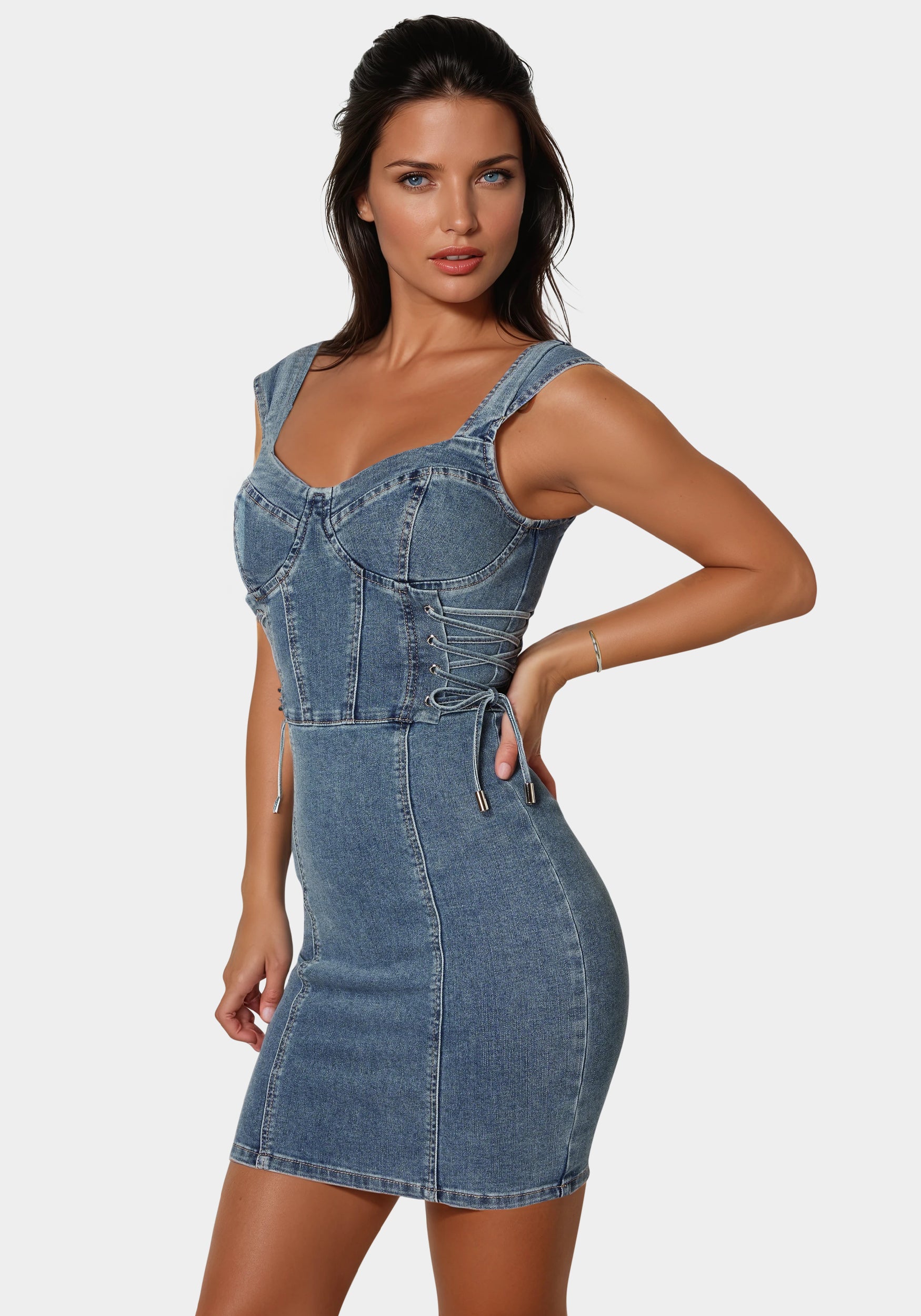 Chic mini denim dress with cap sleeves and adjustable side lace-up detail. Perfect for casual outings, dates, or as a versatile day-to-night option.