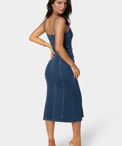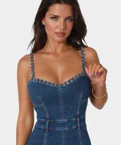 Unique sleeveless midi dress with gold metal chain trim and adjustable straps. Ideal for casual summer events or stylish daytime wear.
