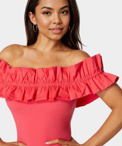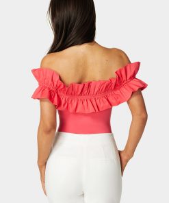 Bebe Women’s Off Shoulder Poplin Ruffle Knit Bodysuit | Hibiscus