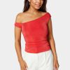 Bebe Women’s Off Shoulder Poplin Ruffle Knit Bodysuit | Hibiscus