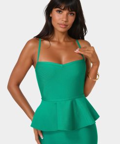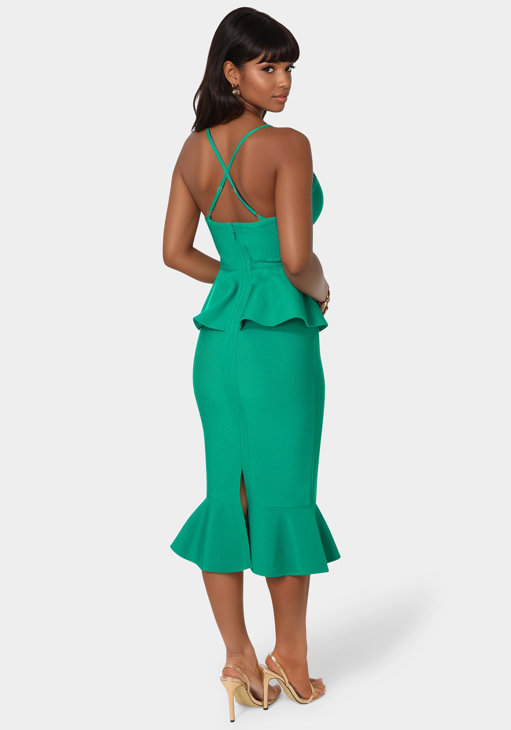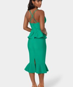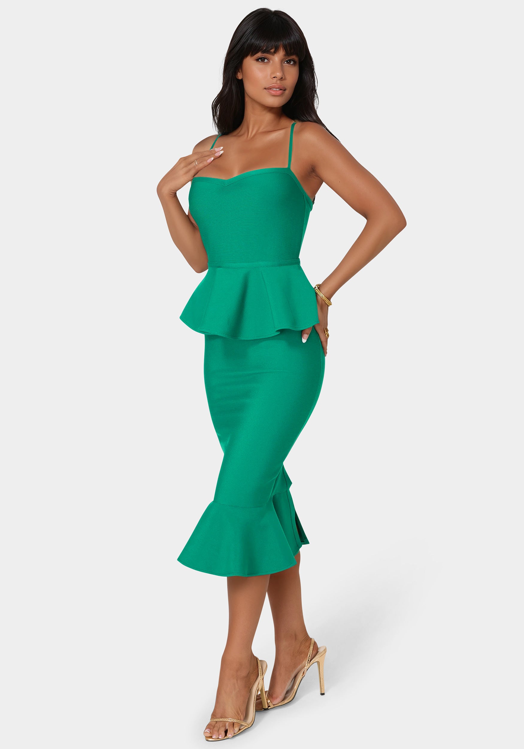 Peplum-accented midi dress with a structured fit and sleeveless design; a polished pick for upscale evenings.