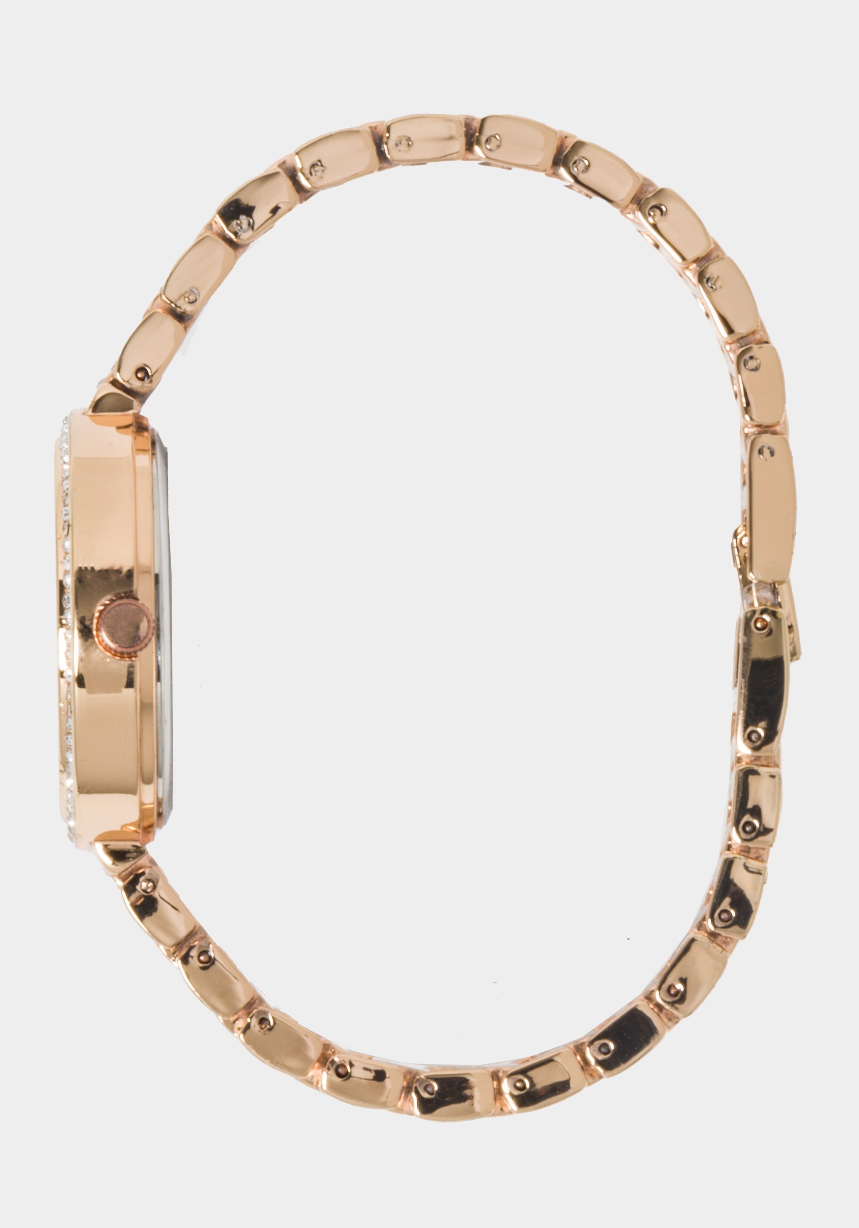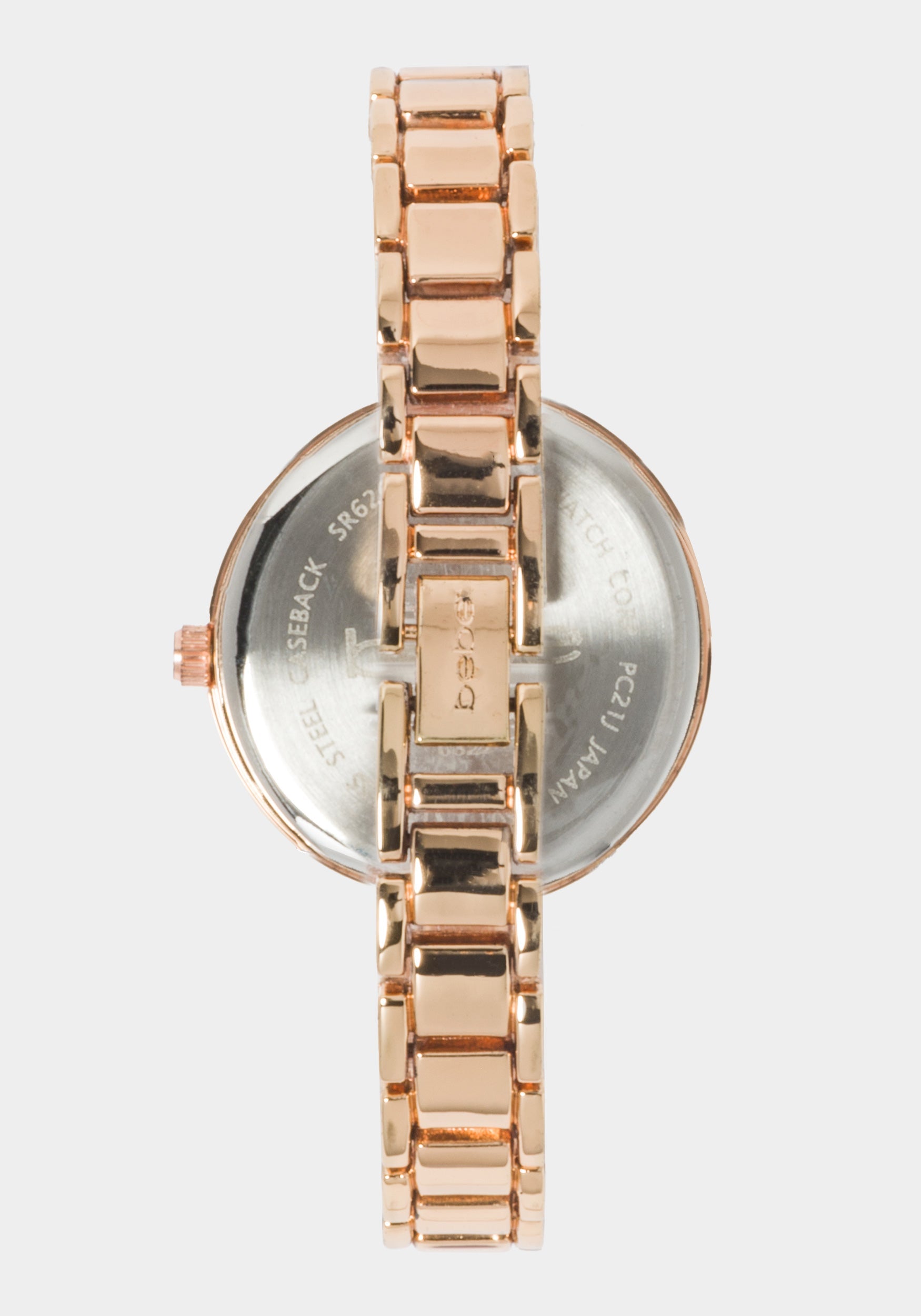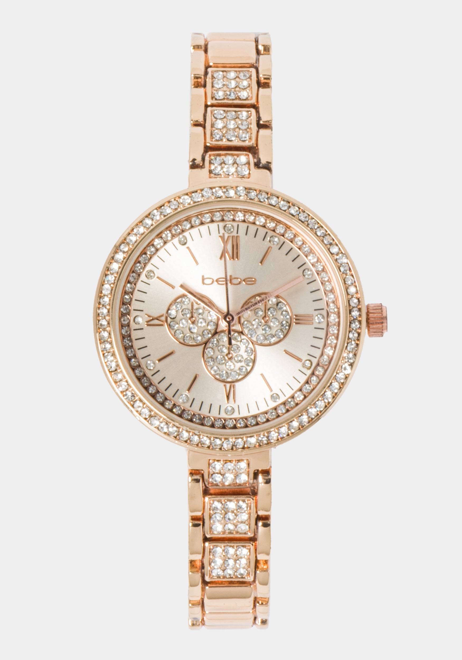 A stylish choice for everyday wear, this rose gold tone bracelet design sparkles with crystals on the bezel and subdials, and clear pavé crystals on the dial.