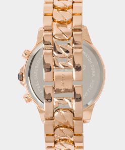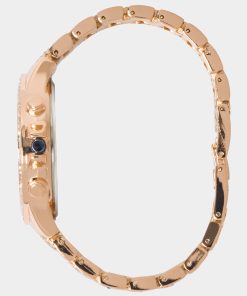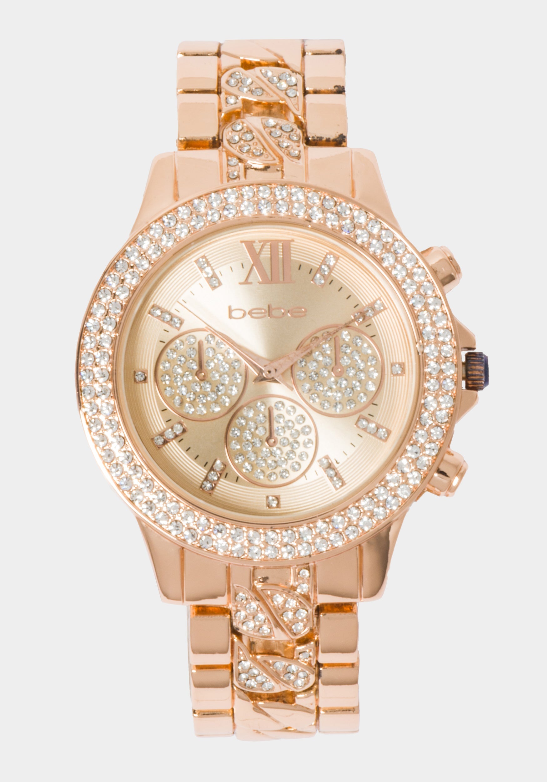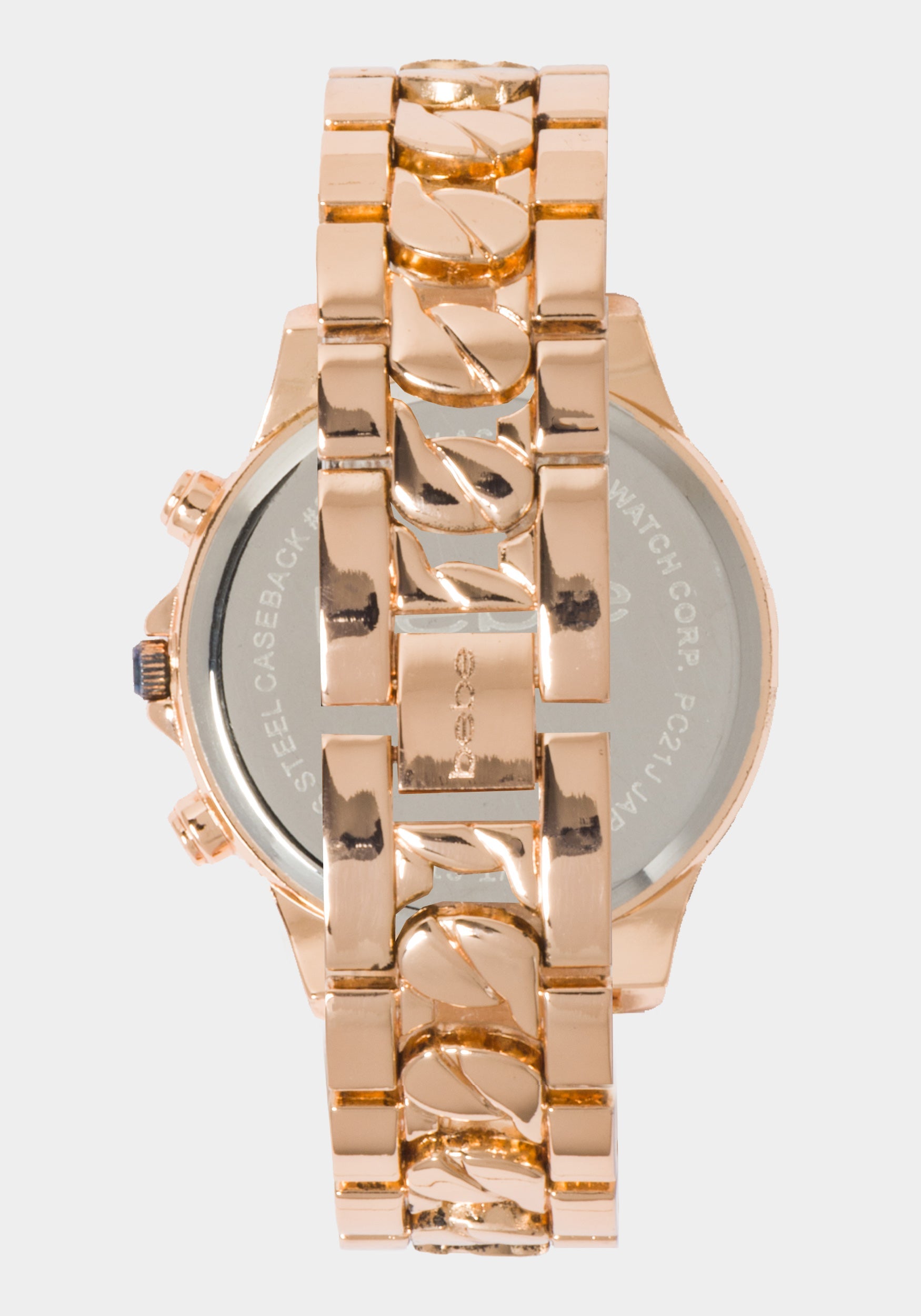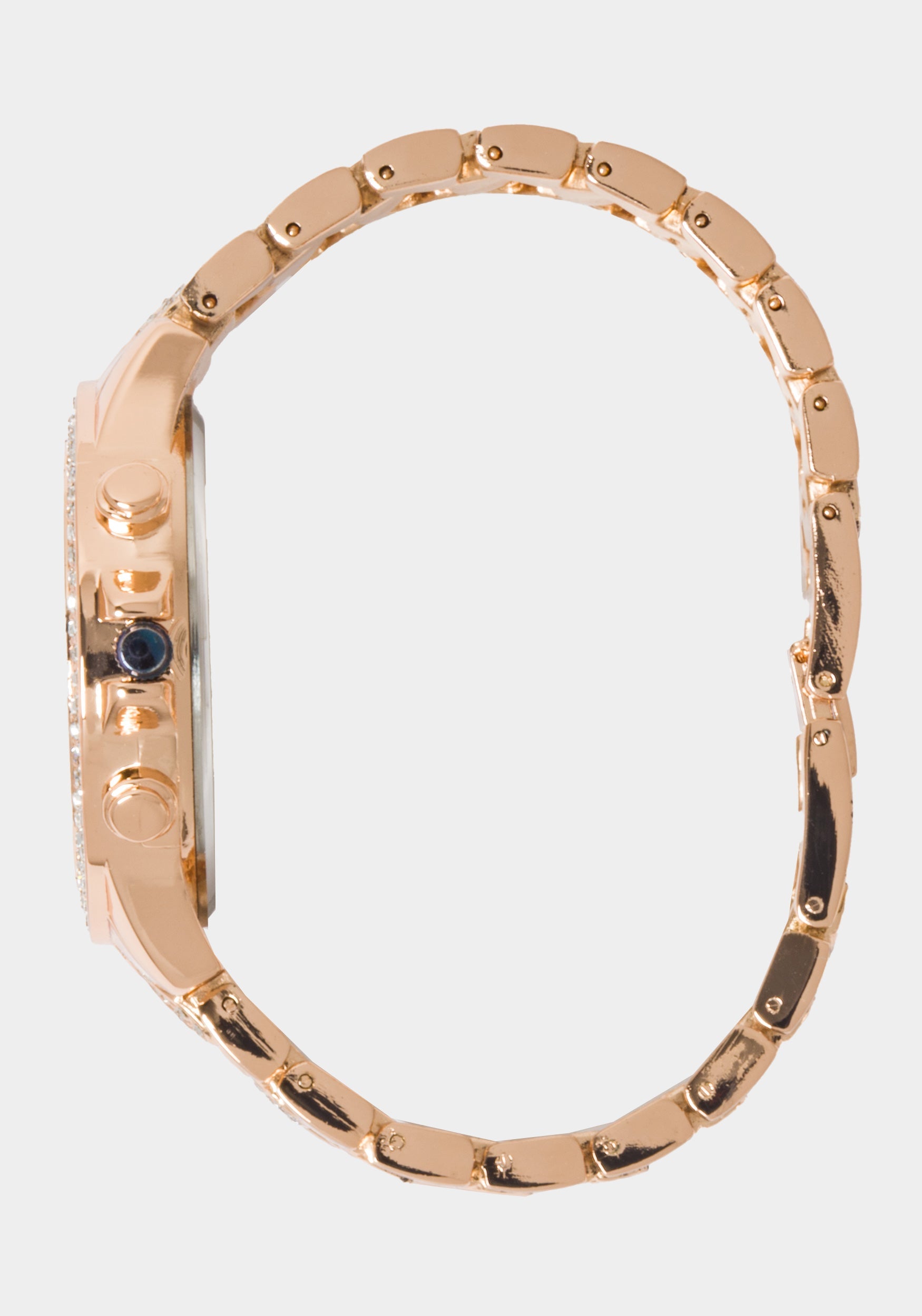 Perfect for day or night, this two-tone bracelet design features both rose gold and silver finishes, crystals on the bezel and sub dials, finished with clear pavé crystals studs along the chain.
