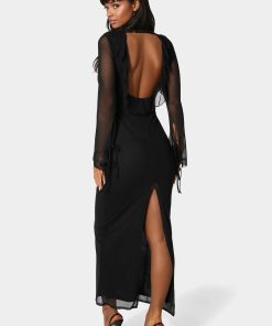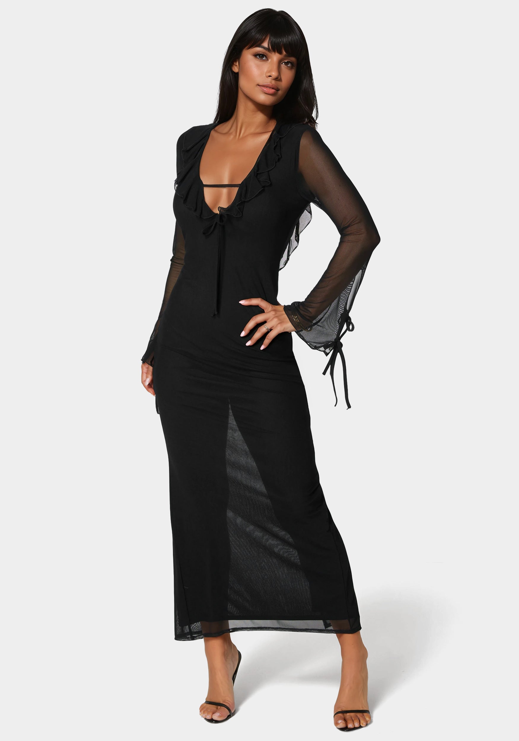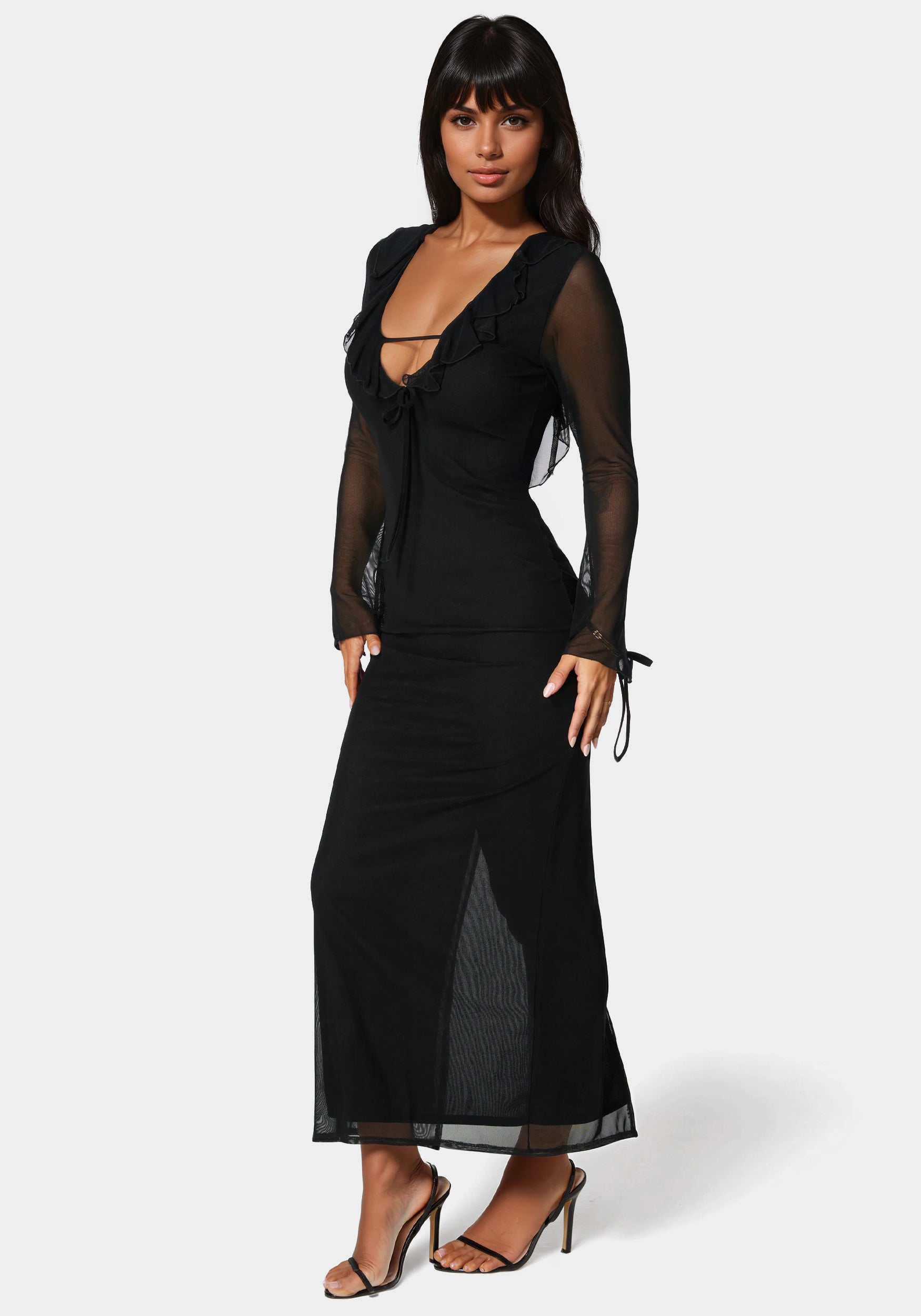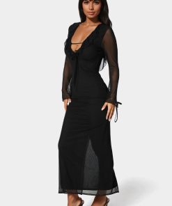 Make an entrance with this mesh maxi, adorned with delicate ruffle details. Its floor-length design adds flow and drama, making it the perfect companion for weddings, galas, or romantic evenings under the stars.
