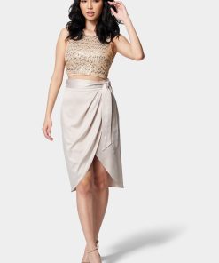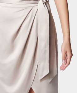 Made in a sheeny satin fabric, this front wrap skirt features a tulip style hem, a side tie at the waist, and a midi silhouette that’s perfect for a polished office or business casual look.