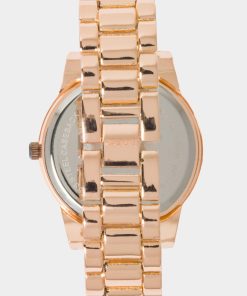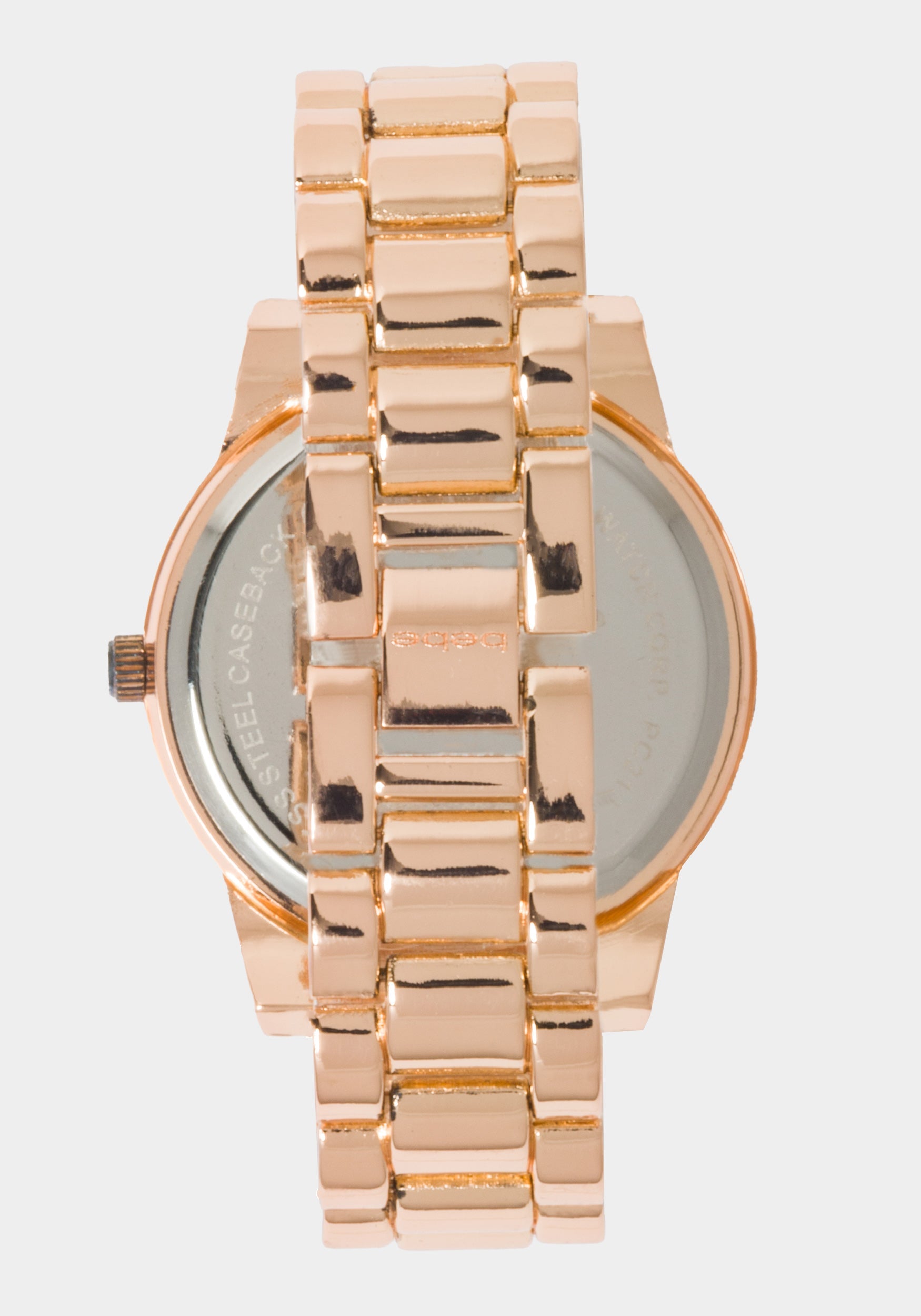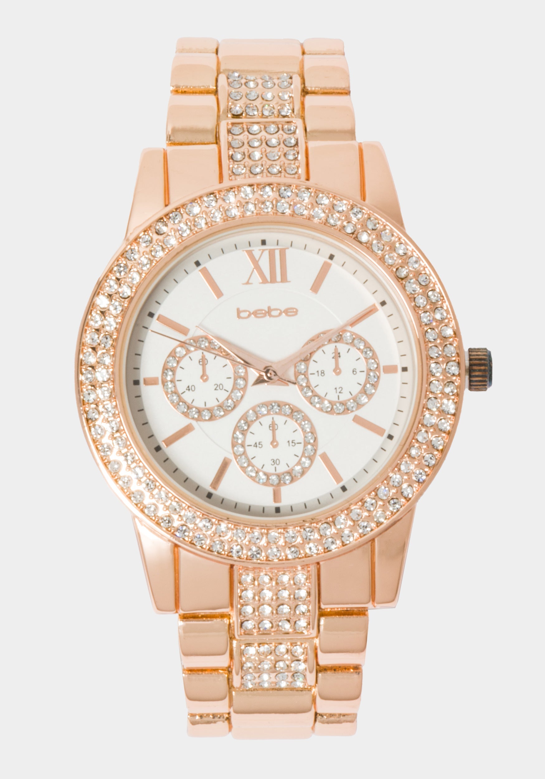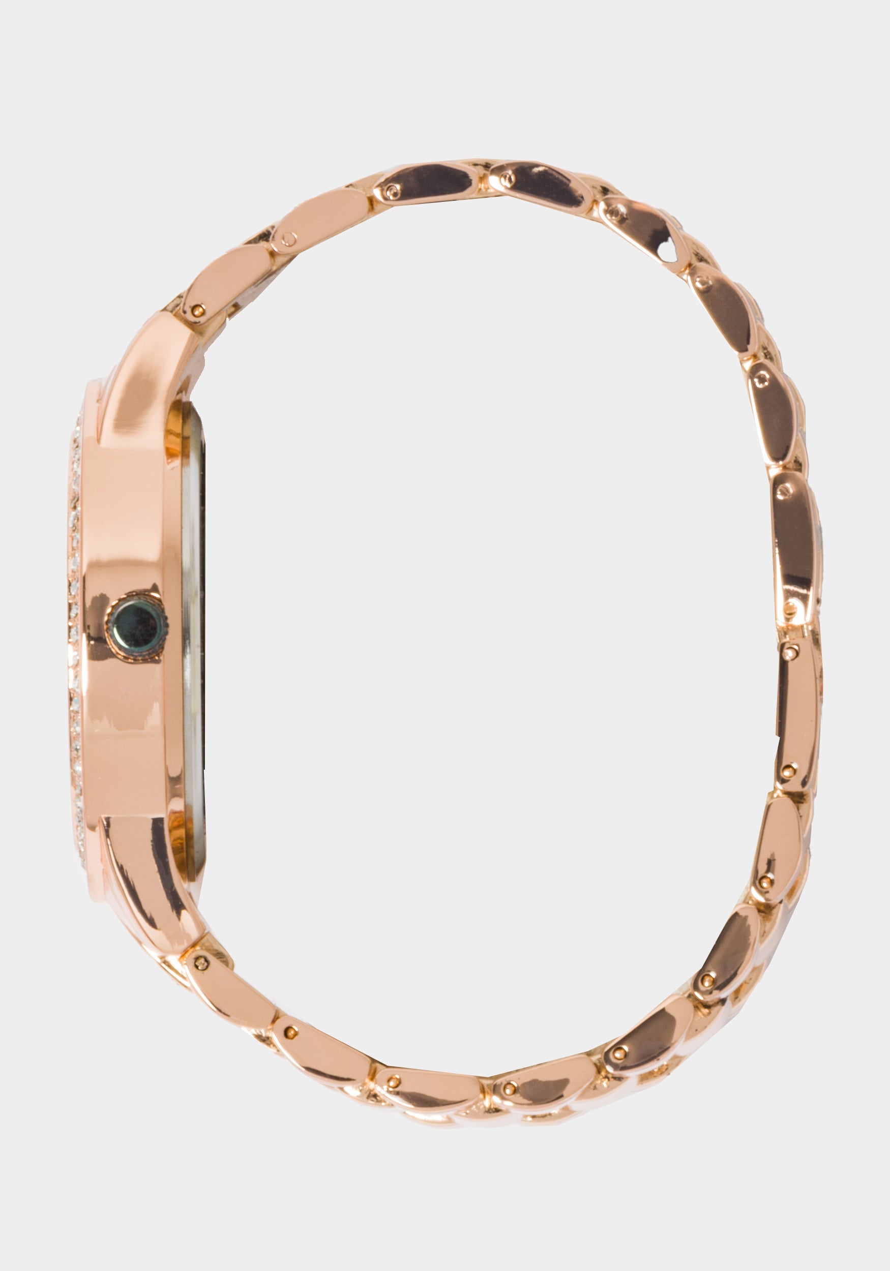Bold and feminine, this rose gold tone bracelet design sparkles with crystals on the bezel and dials, and clear pavé crystals along the chain.