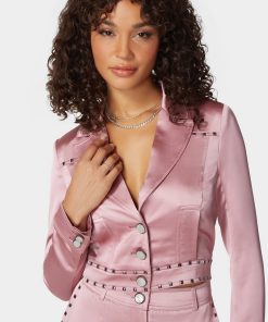 Command every room with the Stud Detail Tailored Satin Blazer – a garment that speaks volumes of your daring style. Each stud glints as a symbol of your fearless fashion sense, while the glossy satin envelops you in an unapologetically bold silhouette. Tailored for a razor-sharp fit, this blazer is the epitome of edge meets luxury.