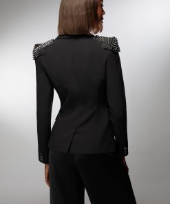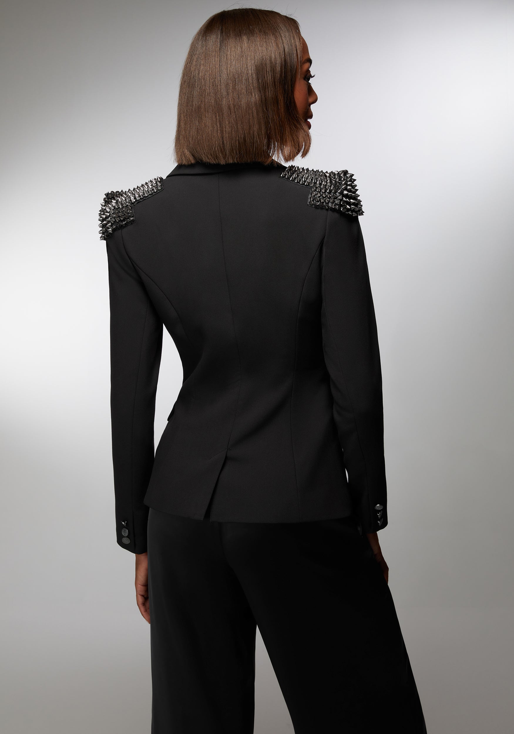Elevate your power-dressing game with the bebe x Ciara tailored blazer. Crafted with a fearless attitude, this piece flaunts audaciously studded shoulders that make a bold statement. Its sleek double-breasted design commands attention, ensuring you’re not just in the room, you’re owning it. Perfect for those days (or nights) you want your look to scream “boss.”