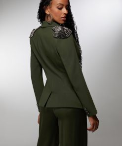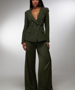 Elevate your power-dressing game with the bebe x Ciara tailored blazer. Crafted with a fearless attitude, this piece flaunts audaciously studded shoulders that make a bold statement. Its sleek double-breasted design commands attention, ensuring you’re not just in the room, you’re owning it. Perfect for those days (or nights) you want your look to scream “boss.”