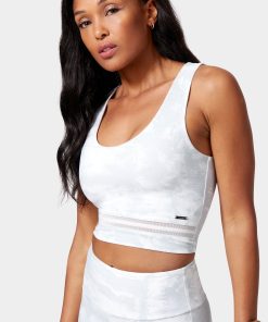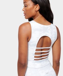Meet your match! This bold logo tank features an all-over marble print with mesh trim and a laddered cutout back for some edge. Pairs well with the Bebe Logo Legging With Mesh Detail or the Bebe Logo Biker Short.