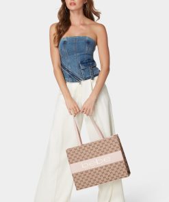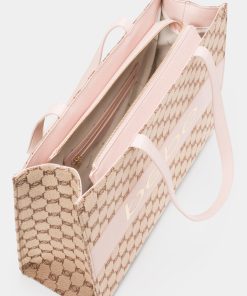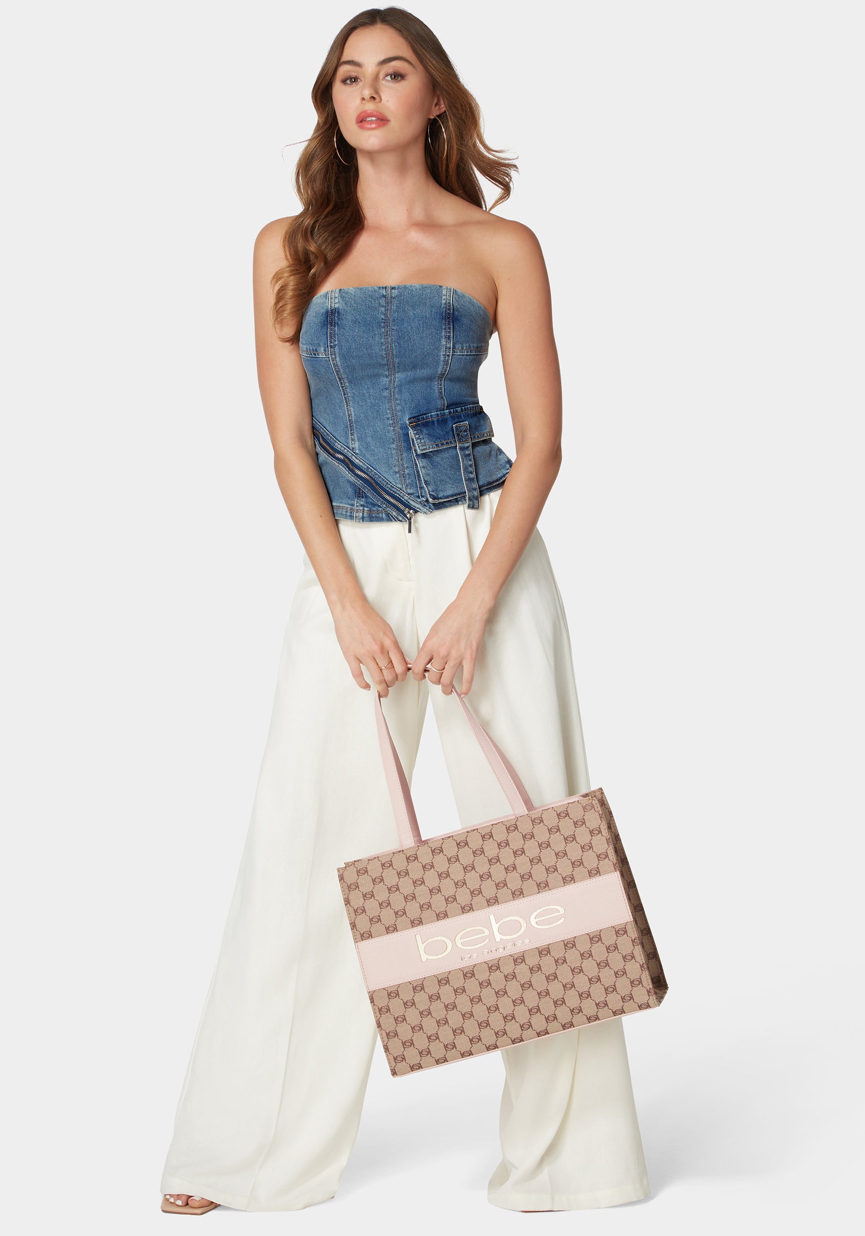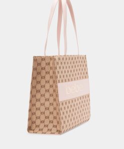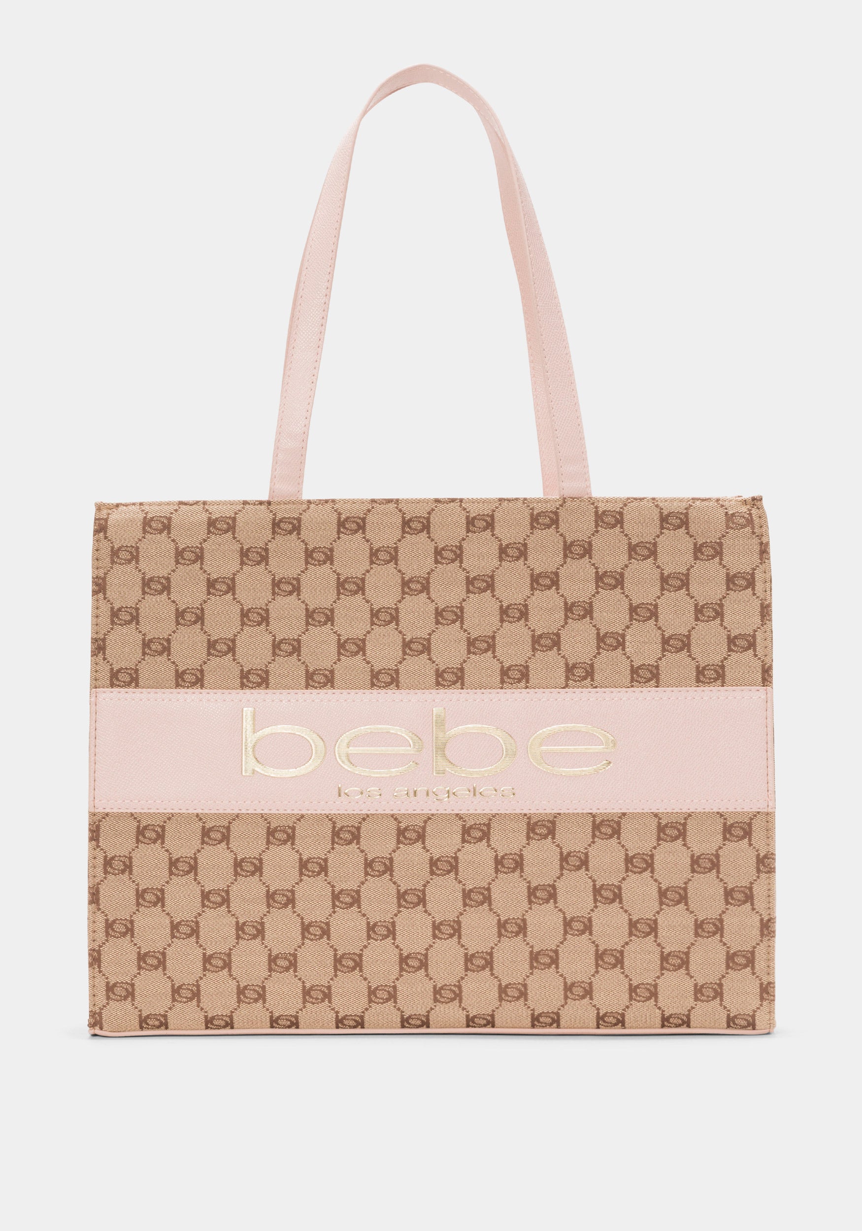 A spacious tote that’s as practical as it is chic. Flaunting the iconic bebe logo on powder pink jacquard, this bag will carry your essentials and turn heads, all day, every day.